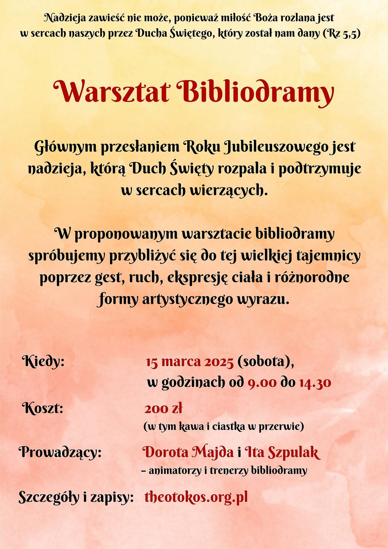 2025sob15marz09:0014:3009:00 - 14:30 Nadzieja zawieść nie możeWarsztaty bibliodramy